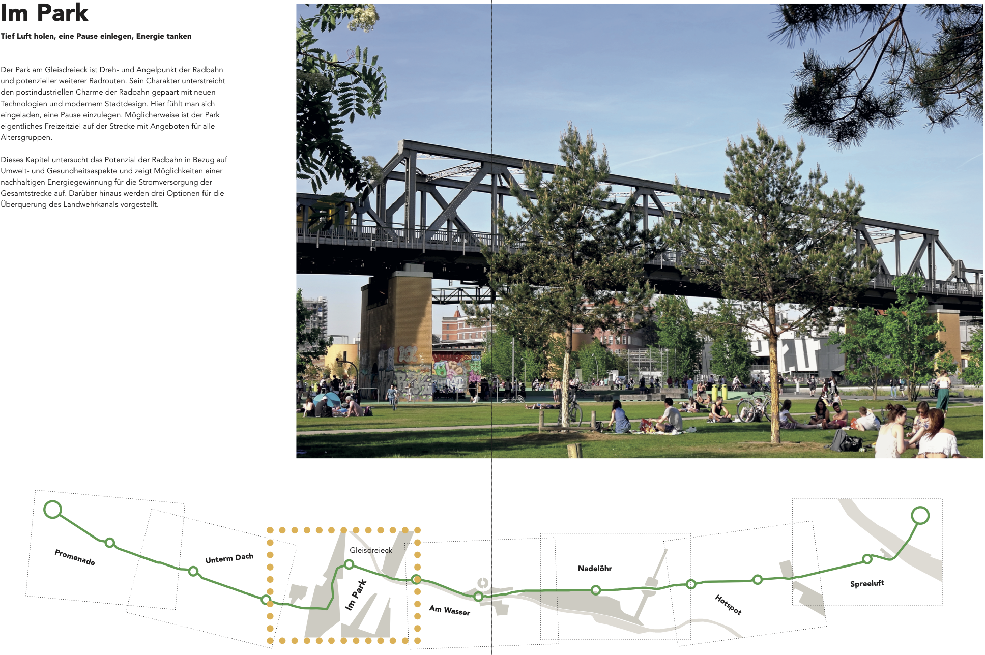 Das Konzept der Radbahn verfolgt den Ansatz einer stadträumlichen Entwicklung mit Fahrradinfrastruktur unter und entlang des weitestgehend vergessenen Raumes des denkmalgeschützten Hochbahnviadukts der Berliner U-Bahn-Linie 1.